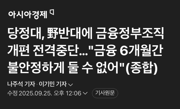금융정부조직 개편 보류, 개혁의 지연과 후퇴를 우려합니다 (25. 9. 25.)