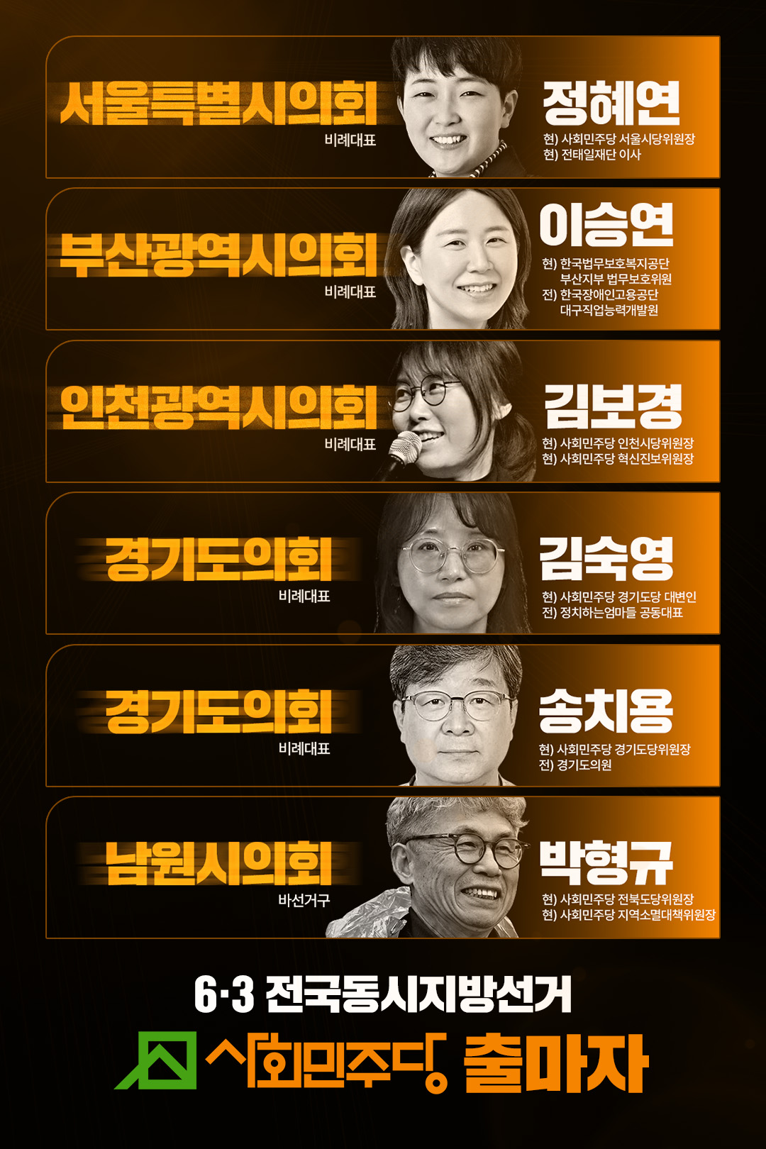이제는 정말로 끝내야 합니다. 이번 지방선거는 낡은 토건 중심의 행정과 정치 세력들의 사익 추구를 끝내고, 시민의 삶 하나하나를 바꾸는 선거가 되어야 합니다. 그 앞에서 가장 현실적이고 체감되는 변화를 만들어내는 역할을 우리 사회민주당이 해내겠습니다.