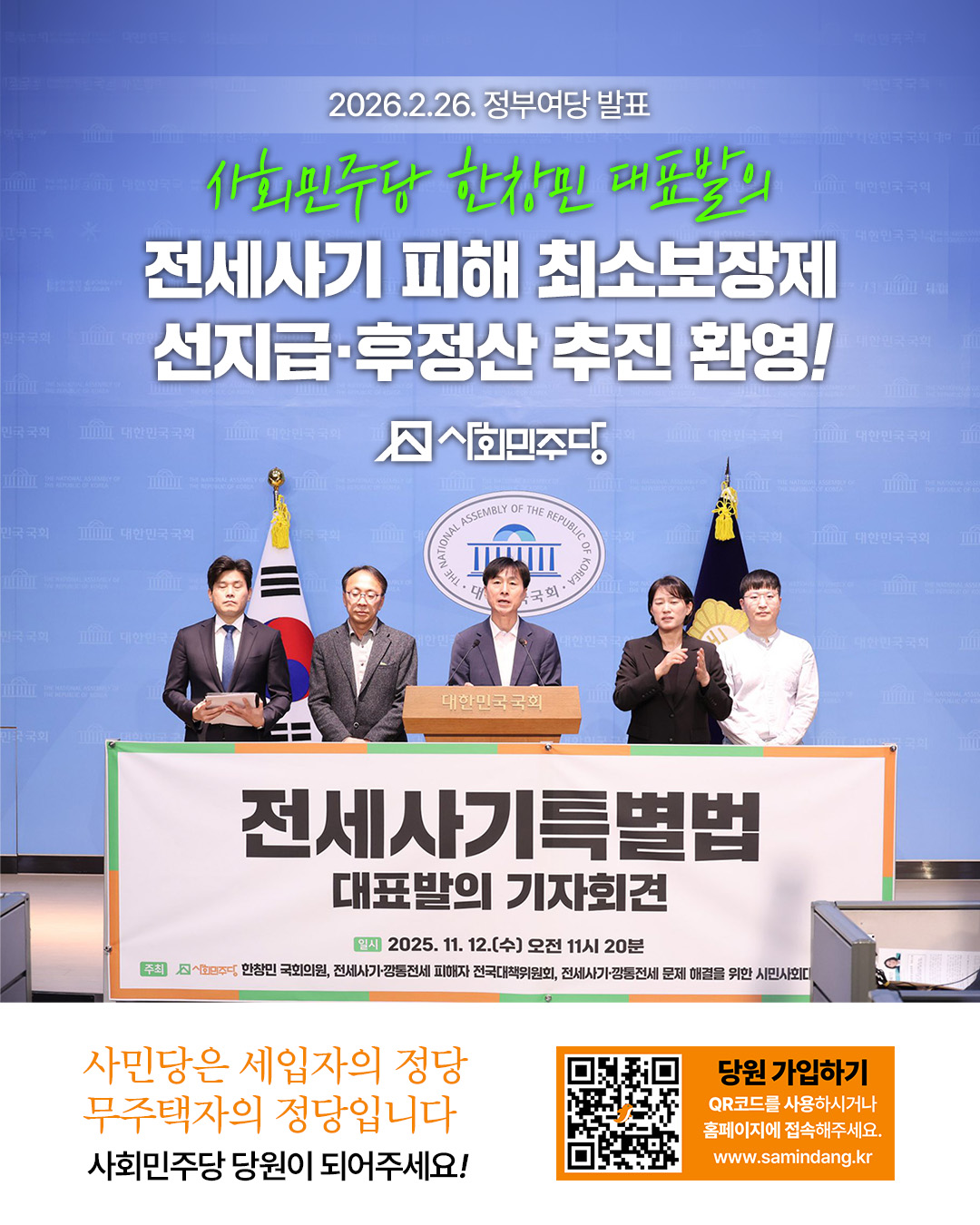 [정부여당의 전세사기 피해 최소보장제, 선지급·후정산 추진을 환영합니다] 전세사기 첫 희생자의 3주기를 앞두고, 뜻깊은 변화가 시작됐습니다.지난해 10월 저와 사회민주당이 대표발의한 법안의 핵심내용인, 전세사기 피해자들의 보증금 회복을 일정 비율 보장하는 ‘최소보장제’와 ‘선지급·후정산’을 정부와 민주당이 추진하겠다고 밝혔습니다.최소보장제는 저와 사회민주당이 최초로 발의했고, 선지급·후정산도 현재 발의된 법안 중 유일한 내용입니다.내일은 전세사기 첫 번째 희생자의 3주기가 되는 날로, 정부여당의 정책 발표가 더 뜻깊습니다.